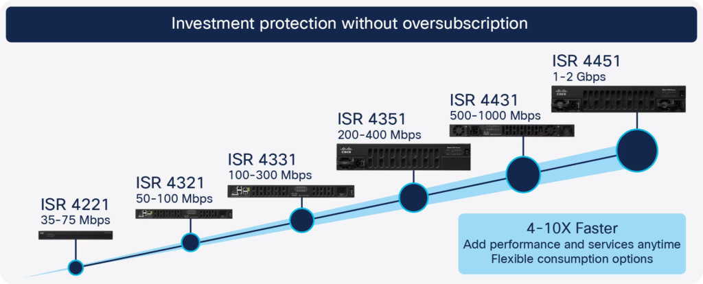 بنابراین شما همه چیز مورد نیاز خود را در یک پلتفرم دریافت می کنید. سری ISR 4000 ماژولار و قابل ارتقا است، بنابراین می توانید خدمات جدیدی را بدون تغییر تجهیزات اضافه کنید. این برنامه همزمان از چندین سرویس آگاه از برنامه پشتیبانی می کند و در عین حال عملکرد WAN تا 2 گیگابیت در ثانیه را حتی در هنگام بارهای ترافیکی سنگین حفظ می کند. معماری Backplane از ارتباطات ماژول به ماژول با پهنای باند بالا با سرعت 10 گیگابیت در ثانیه پشتیبانی می کند.